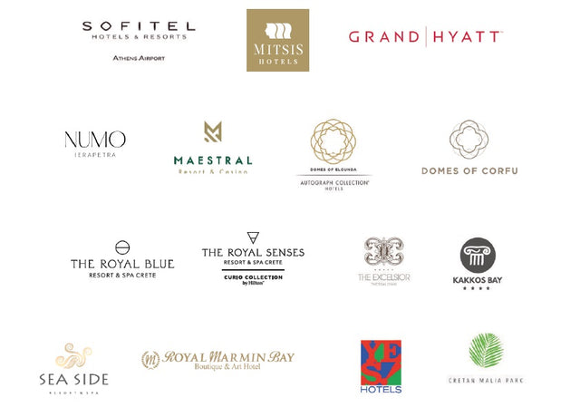 Descoperă mai jos câteva dintre lanțurile hoteliere unde suntem prezenți: Grand Hyatt, Momi Slow Living Hotel, The Excelsior Greece, hoteluri din lanțul Autograph Collection, Sofitel, Maestral Resort & Casino, Domes of Elounda, The Royal Sense Resort & SPA, Mitsis, Numo, Acro Resort, The Royal Marmin Bay, Kakkos Bay, Domes Of Corfu, Cretan Malia Park, etc.